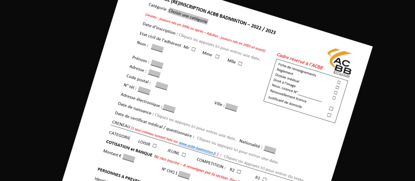 Vous retrouvez le détails des documents attendus et nos cotisations sur la page pour adhérer à la section Badminton de l’ACBB. Petite nouveauté cette année : pour bénéficier du tarif « Boulonnais », un justificatif de domicile daté de moins de 3 mois au nom de l’adhérent ou de son responsable légal (si mineur) vous sera demandé (nous ne le conserverons pas, mais il faudra le présenter).